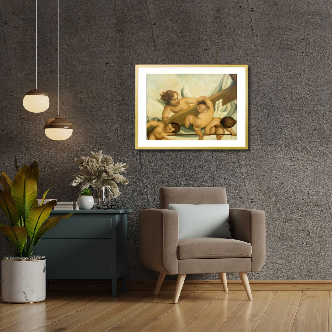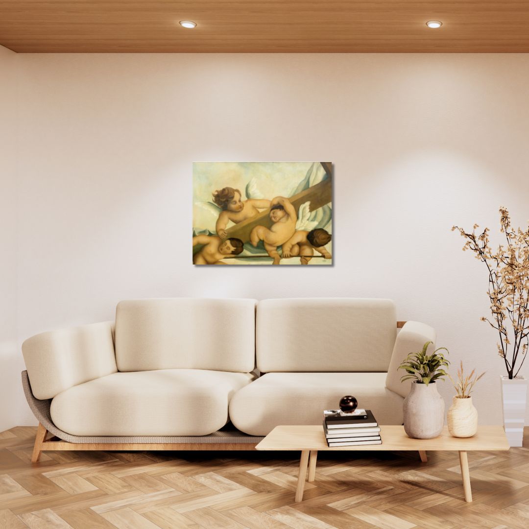 Inspired by these beautiful motifs, I photographed a detail of the angel paintings and recreated it using traditional techniques. I drew the motif in a careful grid pattern and painted it in oil on canvas. To capture the feel of the historical originals, I cracked and patinated the surface, giving the work an authentic, timeless character.