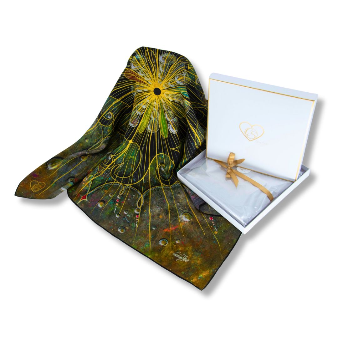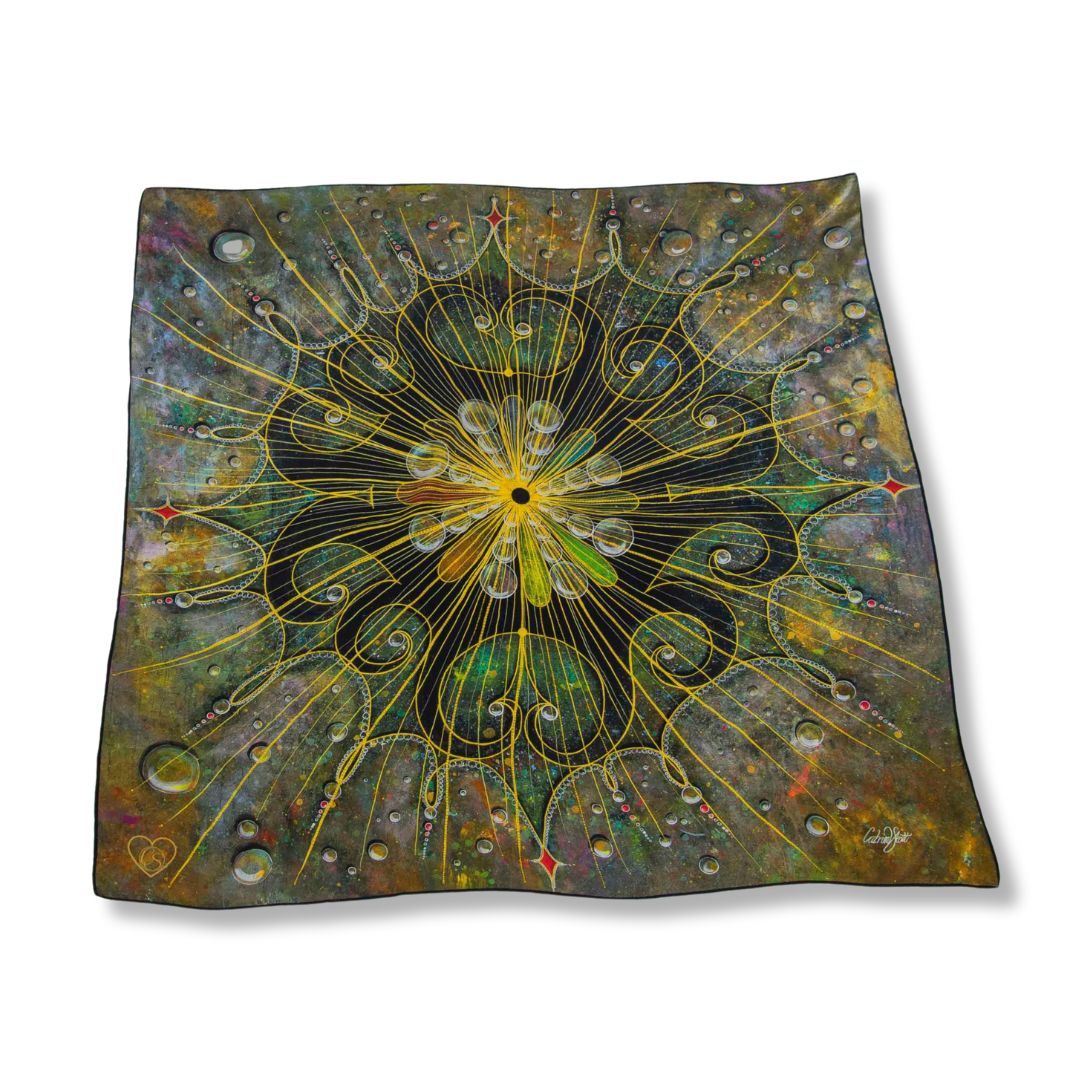 Scarf in 100% silk twill 90x90 cm with hand-rolled edges with motif "Rebirth" in unique print painted by Catrin Skött.