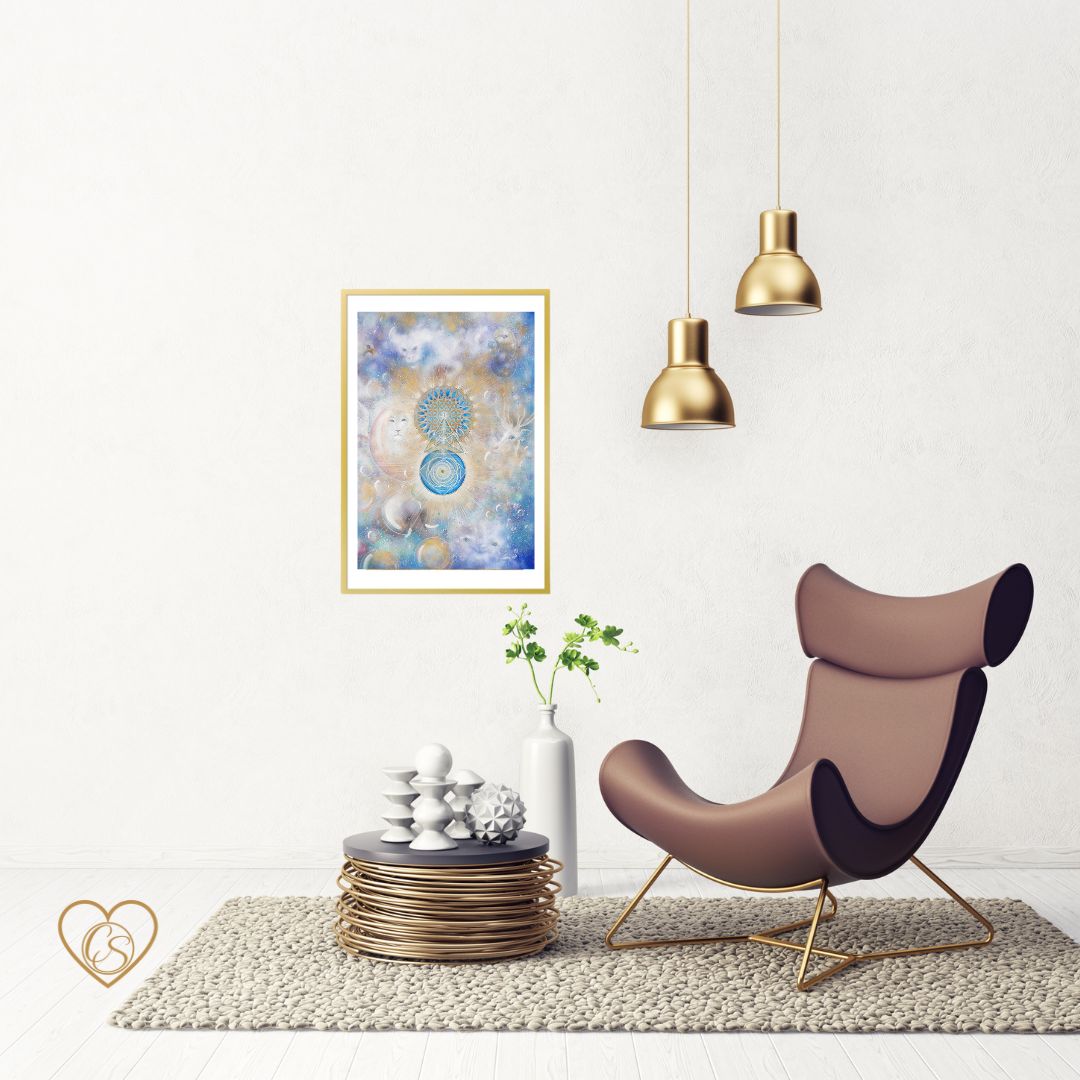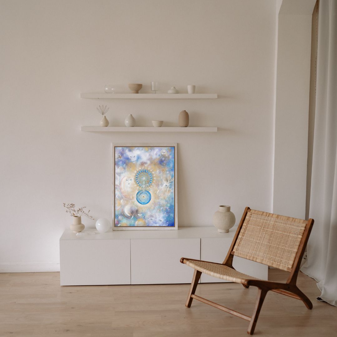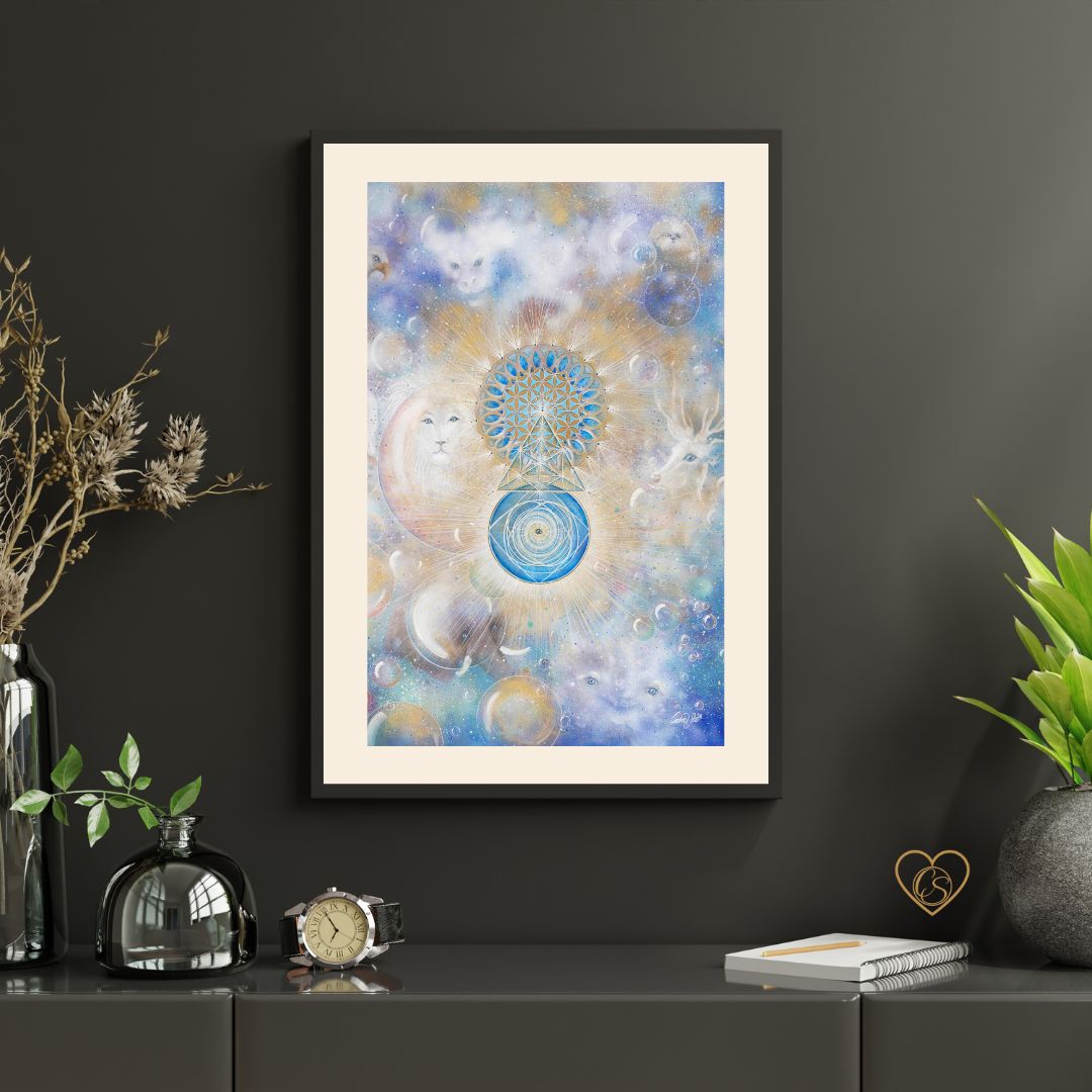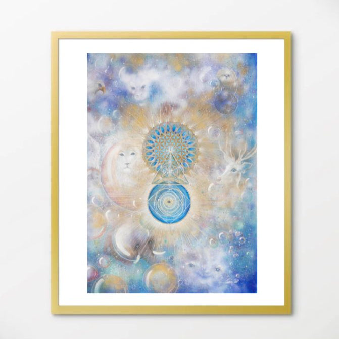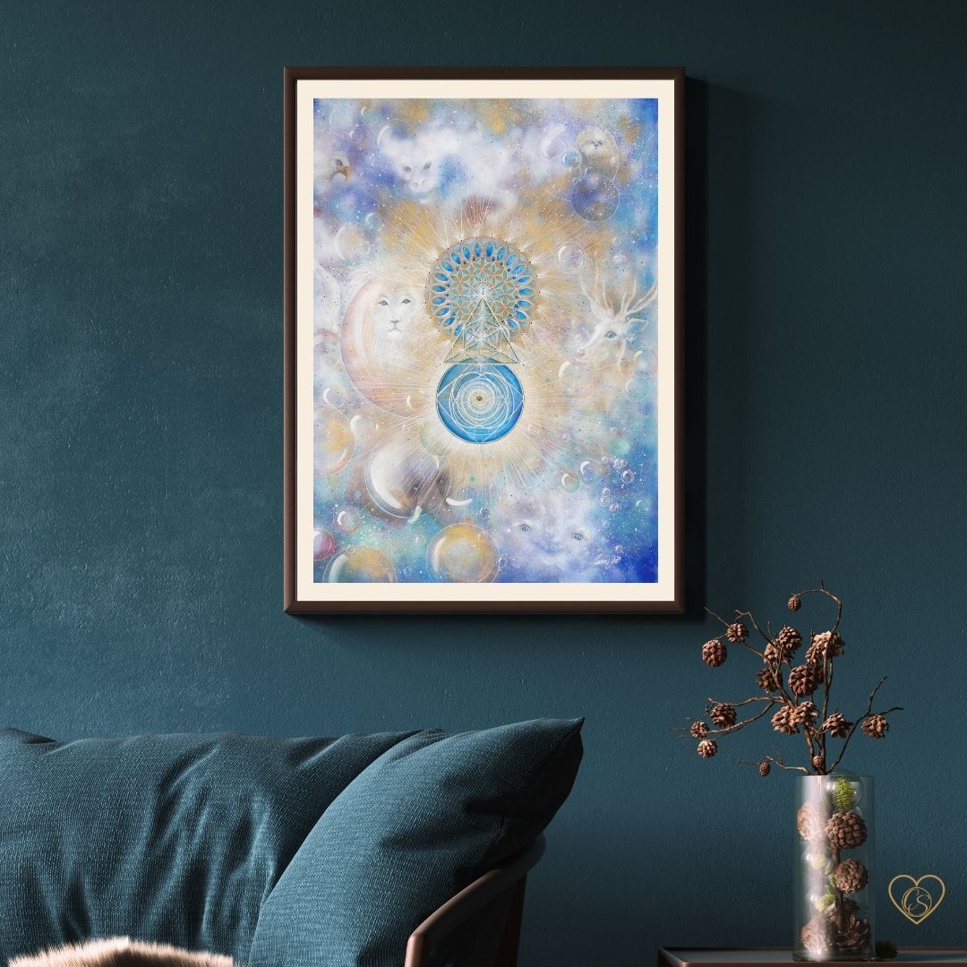 In the center of the painting, the golden geometry sprouts – a blooming consciousness, a coded map home to your inner self.