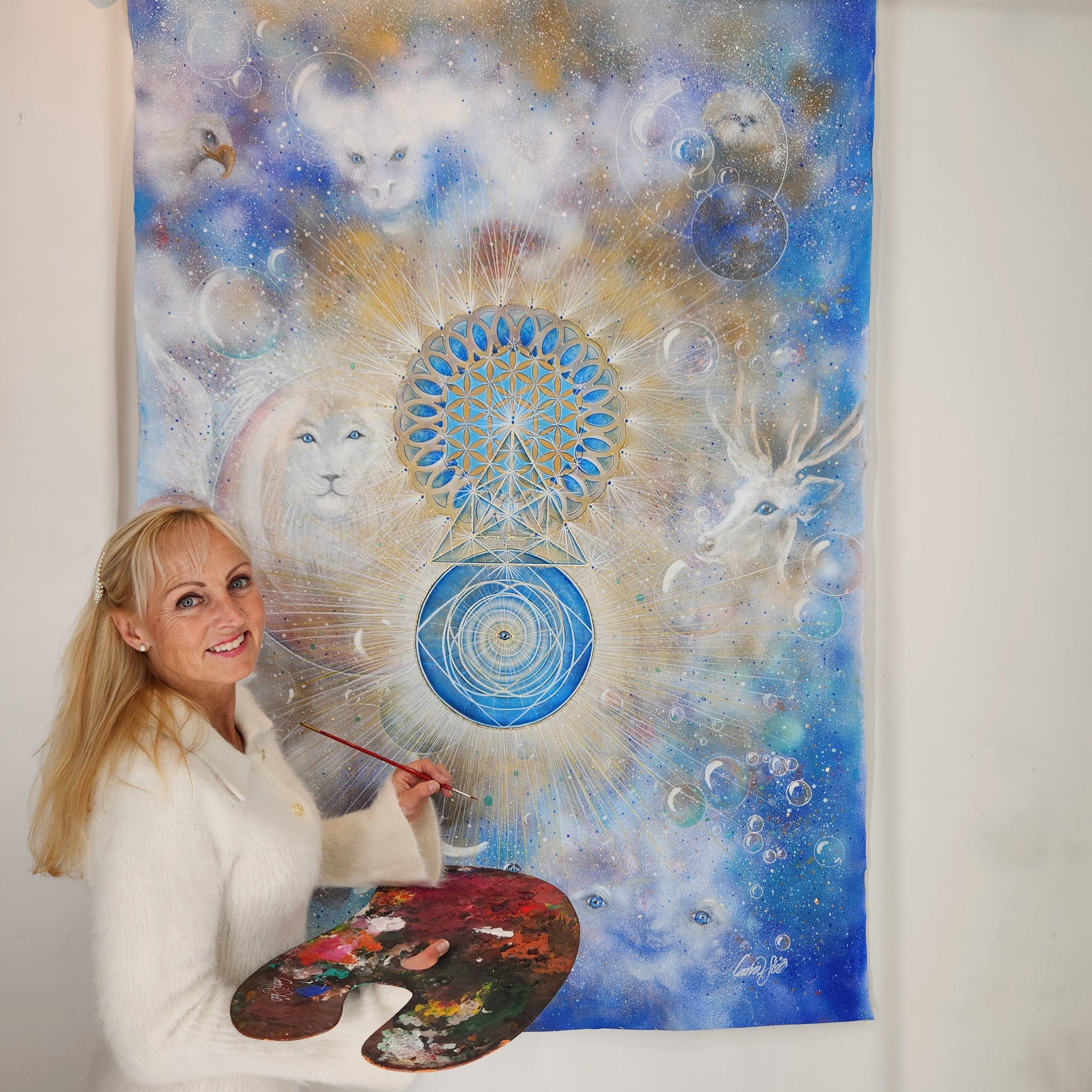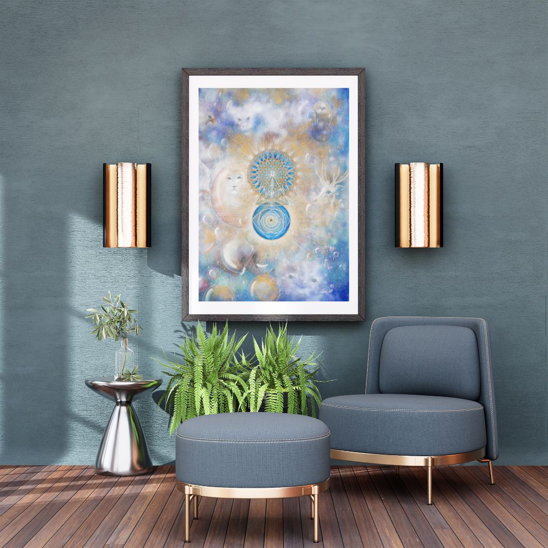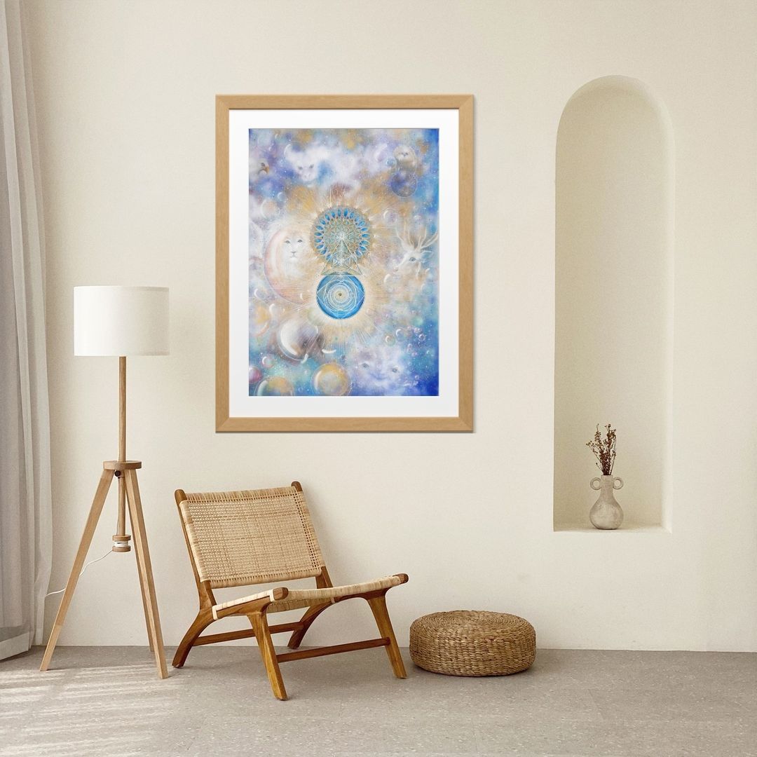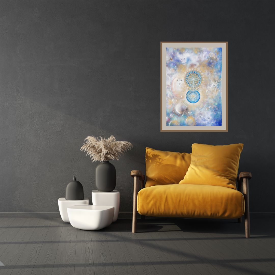 In the center of the painting, the golden geometry sprouts – a blooming consciousness, a coded map home to your inner self.