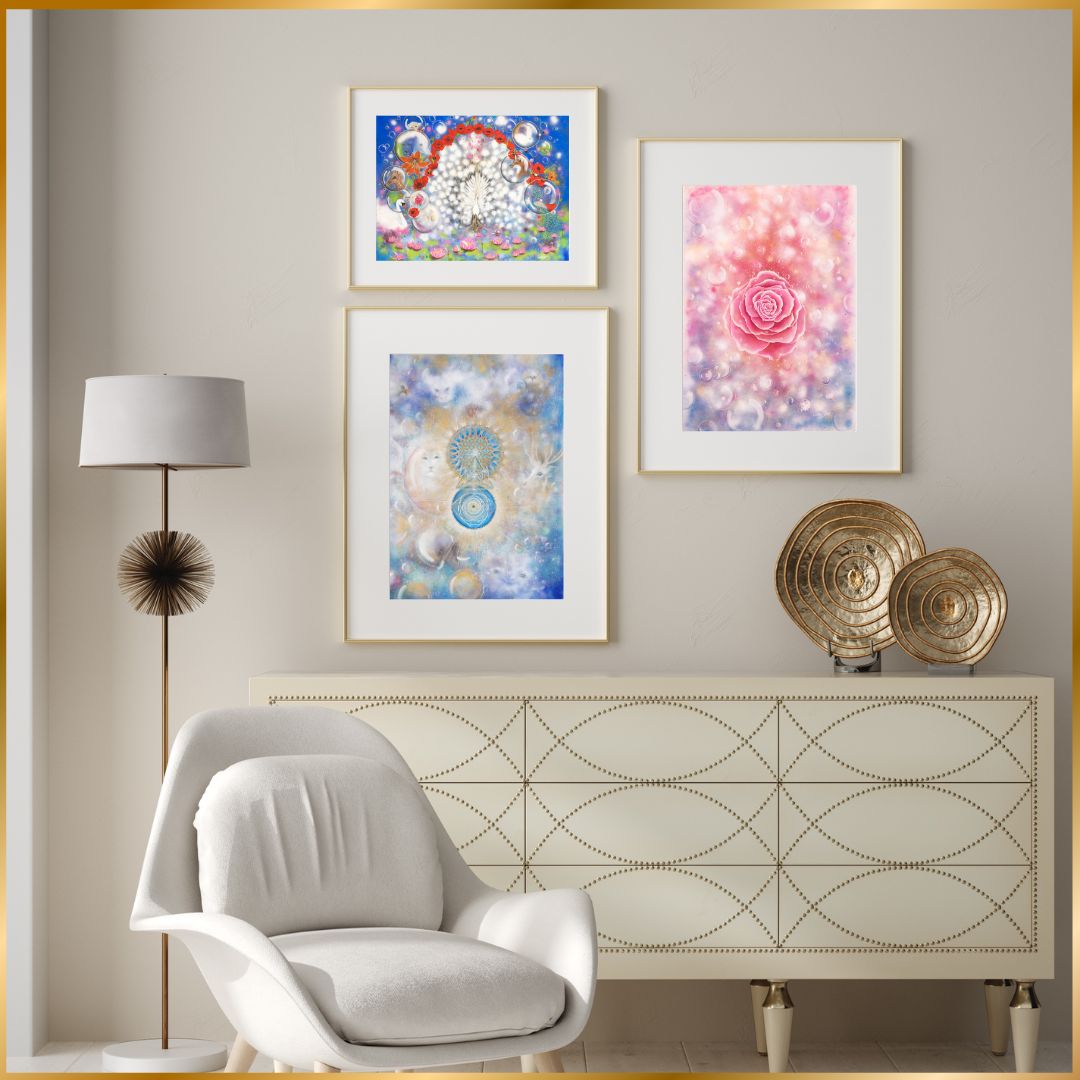 In the center of the painting, the golden geometry sprouts, a blooming consciousness, a coded map home to your inner self.